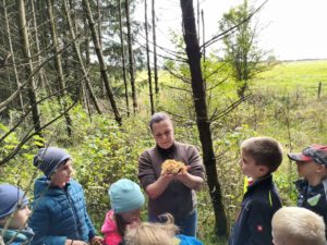 Die Kinder staunten, als ein Hexenröhrling beim Anschneiden plötzlich blau wurde und lachten, als Sarah berichtete, dass der Klebrige Hörnling in der Pfanne sogar hüpfen kann. An einer Kiefer entdeckten wir die Krause Glucke, die nicht nur lustig aussieht, sondern auch sehr gut schmecken soll. Auch den Zunderschwamm lernten wir kennen – früher nutzten die Menschen ihn, um Feuer zu machen. Außerdem erfuhren wir, dass Pilze nicht nur Nahrung sind: Aus ihrem Geflecht kann man sogar Pilzleder herstellen, das für Hüte, Taschen oder Kleidung genutzt wird.